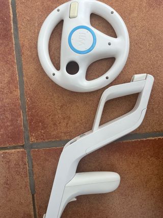 Set de accesorios para Wii. - Volante blanco con detalles azules. - Mando blanco con agarre ergonómico.