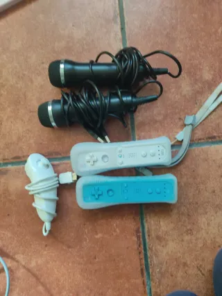 Pack de accesorios para Nintendo Wii que incluye dos micrófonos negros con cable y dos mandos (uno blanco y otro azul) con sus fundas protectoras. - Dos micrófonos negros con cable. - Un mando Wii blanco. - Un mando Wii azul. - Dos fundas protectoras para mandos.