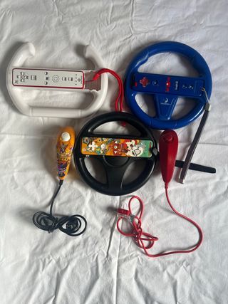 Lote de tres mandos y tres volantes para Nintendo Wii. - Incluye mandos con diseño blanco, azul y rojo y uno de pokemon - Volantes de diferentes colores y diseños y uno tipo de formula 1 - Accesorios para juegos de carreras. - El mando de pokemon y el blanco funcionan el azul no enciende el resto esta bien solo que el volante azul y el mando azul no encaja bien y tiene un ligero juego LEER BIEN: EL PRECIO ESTA AJUSTADO Y ES LIGERAMENTE NEGOCIABLE SE HACEN ENVIOS SOLO POR CORREOS 📦