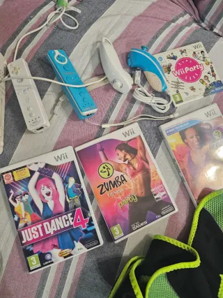 Lote de juegos y mandos para Nintendo Wii. - Juego: Just Dance 4 - Juego: Zumba Fitness: Join the Party - Juego: Wii Party - Mando Wii (blanco) - Mando Wii (azul) - Nunchuk (azul) - Mando Wii (blanco)
