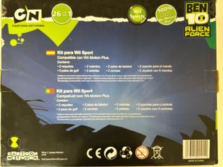 Set de accesorios para Wii sports de Ben 10 Alien Force. Incluye 2 volantes, 2 raquetas y 2 palos de beisbol, 2 soportes para el mando, 2 palos de golf, 2 pistolas, 2 correas y 2 joystick con 5 mandos. Compatible con Wii Sports y Wii Motion Plus.