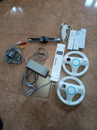 Nintendo wii sports del 2006 con accesorios. - Volante para Wii. - Mandos Wii Remote y mando con joystick - Cables de conexión. - Numerosos juegos: Super Mario Bros, super Mario galaxy, just dance 3, Mariokart wii, wii sports, wii sports resort, wii party