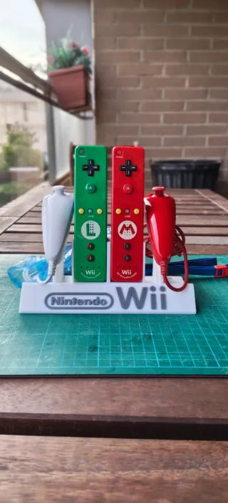 Luce tu Wii como nunca!! Soporte de sobremesa para mandos y baterías. - Soporte para dos mandos Wii con su fundas. - Organizador para nunchuks - Compartimiento para Motion Plus adapter Impreso en 3D colores blanco la base y en grises las letras. Diseño limpio y elegante. Ideal para organizar tus mandos. Fabricado con plástico resistente. PD: Mandos Wii, Nunchucks y baterías no incluidos. Si lo queréis personalizar, preguntar por disponibilidad de colores.
