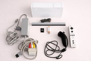 Pack de consola Nintendo Wii en color negro. Incluye todos los cables necesarios para su conexión. - Base para colocar la consola en vertical. - Cable de alimentación. - Cable AV con conexiones RCA (amarillo, blanco, rojo). - Mandos - Tabla para ejercicio - Micrófonos - 13 juegos