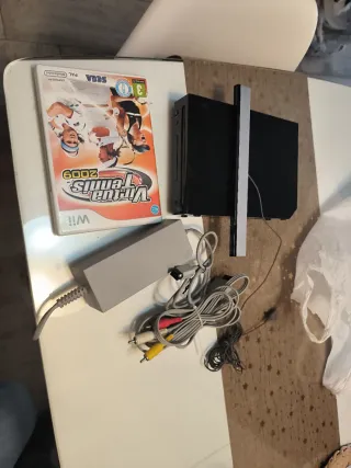 Consola Nintendo Wii en color negro. Está manchada, funciona a la perfección. incluye varios juegos: - FIFA 2015 - Juegos Olímpicos London 2012 - Wii party - Super Mario Bros Wii - Mario Strikers charged football - Just Dance 2014 - Super Mario Galaxy 2 - Fast food panic - Mario power tenis - Mariokart Wii - Wii Sports Resort También incluye 5 mandos con 3 adaptadores para el mando. A parte, trae 3 mandos para Mario Kart, 3 fundas para mandos, 2 soportes para la consola, 2 controladores para el apuntado en la televisión y 2 artilugios para los mandos.