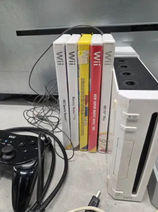 Lote de consola Nintendo Wii con varios accesorios. - Incluye mando Pro Controller. - Incluye dos mandos Wii Remote. - Incluye cables de conexión y cargador. - Incluye sensor bar. - 5 juegos - funciona perfectamente y tiene conector HDMI para tv moderna