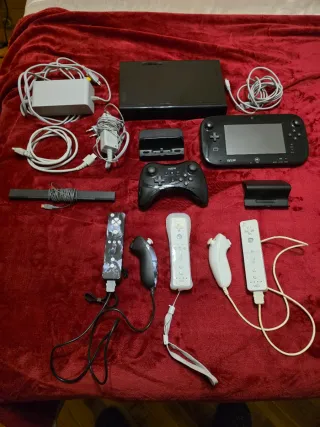 Consola Nintendo Wii U en color negro, junto con una variedad de accesorios para complementar tu experiencia de juego. - Consola Wii U - Mando Wii U Pro Controller (negro) - Mando Wii U Pro Controller (blanco) - Nunchuk (negro) - Nunchuk (blanco) - Wii Remote Plus (rojo) - Wii Remote Plus (negro) - Wii Remote Plus (negro) - Wii Remote Plus (blanco) - Wii Remote Plus (blanco) - Wii Remote Plus (blanco) - Fundas de agarre para mandos (negras) - Correas de muñeca para mandos Pistolas, volantes y figuras para jugar. 4 baterías recargables. 9 mandos