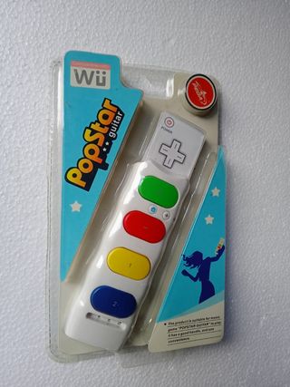 Accesorio de mando tipo guitarra para la consola Wii. Compatible con el juego PopStar Guitar. - Diseño blanco con botones de colores (verde, rojo, amarillo, azul). -En su embalage original. - Incluye botón de encendido (POWER) y cruceta. - Compatible con Wii.
