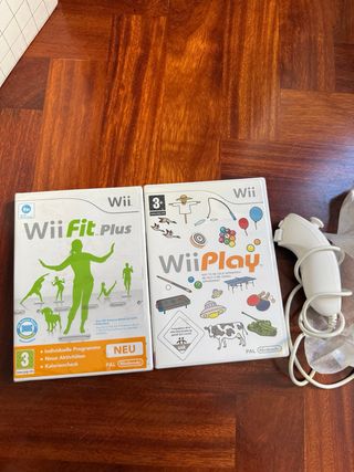 Lote original de Nintendo Wii que incluye dos juegos y un mando Nunchuk. - Juego: Wii Fit Plus - Juego: Wii Play - Mando Nunchuk blanco