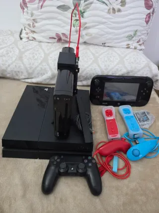 Pack de consola PlayStation 4 fat con versión 9.00 y consola Nintendo Wii U de 32GB. Incluye disco duro SSD y tarjeta SD de 128GB. PS4 con mando en buen estado y el mando de la wiiu lleva puesto y una batería de gran capacidad. Entregaría también batería original . Barra wii, y 2 mandos wii completos con sus nunchuks ( uno azul y otro rojo). - Consola PS4 Slim negra. - Consola Wii U negra de 32GB. - Disco duro externo - Tarjeta de memoria SD de 128GB.