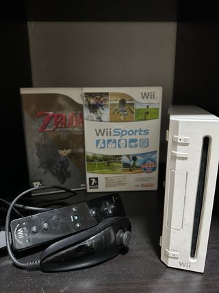 Nintendo Wii (Uso moderado). El pack incluye lo siguiente: - Consola Nintendo Wii - Mando para consola - Todos los cables necesarios - The Legend of Zelda: Twilight Princess - Wii Sports Resort (La funda no es la del juego)