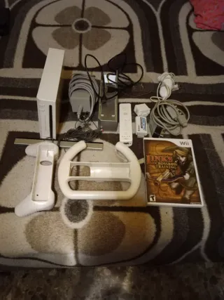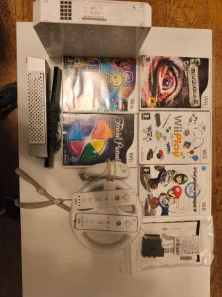Se vende consola Wii en color blanco junto con dos juegos. - Incluye consola Wii. - Juego Mario Kart Wii. - Juego Wii Play. - Juego Trivial Pursuit - Juego Manhunt - Incluye accesorios y adaptadores a todo tipo de TV Dos mandos, accesorio de volante volante y tiro al arco 🏹