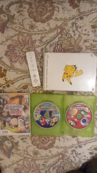 Consola Nintendo Wii en color blanco, con mando y dos juegos. - Incluye consola Wii. - Mando Wii. - Juego: Naruto Shippuden: Ultimate Ninja 3. - Juego: Mario Party 8. - Juego: Super Mario Galaxy. Tiene los cables ✅
