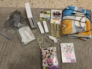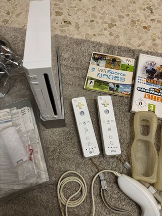 Se vende consola Nintendo Wii en color blanco, junto con varios juegos. - Consola Wii - Mando Wii Remote (x2) - Nunchuk (x1) - Fundas para mandos (x2) - Juego Wii Sports - Juego Family Trainer Extreme Challenge - Juego U-Sing 2 (x2)