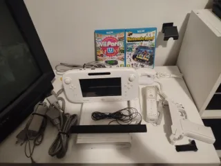 Consola Nintendo Wii U en color blanco, junto con varios accesorios. - Completa con Embalaje y Manuales. - Incluye dos juegos: Wii Party U y Nintendo Land. - Incluye mando Wii U, 2 Nunchuk, 2 Wii Remote Plus y Pistola Wii - Incluye cables y adaptadores de corriente. - Incluye cable Scart - Incluye Soporte para TabletoMando