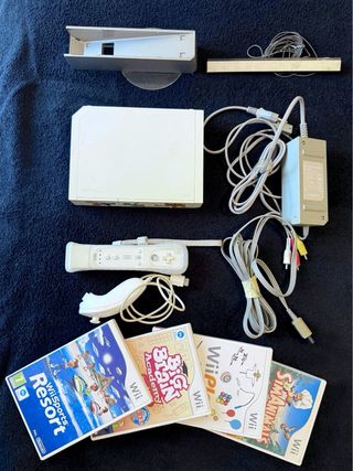 Vendo una consola Nintendo Wii blanca En la imagen se puede ver que va con todos los accesorios originales: -Base se soporte vertical -Adaptador de corriente -Cable de video compuesto AV -Barra sensora inflarroja -Mando principal -Nunchuk -Funda de silicona especial Wii sports resort con accesorio para el juego Además, lleva 4 juegos totalmente gratis, si quieres añadir otros de mi catálogo te haré precio por el lote. El estado de esta Wii es evidente, está muy usada y con marcas de pegatinas, pero su funcionamiento es perfecto y durará mucho más. (Solo envío por correo)