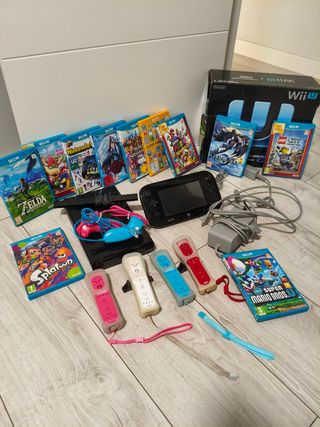 Consola Nintendo Wii U en color negro, lista para horas de diversión. - Incluye varios videojuegos populares. - Viene con mandos adicionales y accesorios.