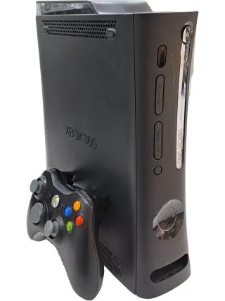 Consola Xbox 360 Elite FAT en color negro, modelo Jasper del año 2009. Incluye un mando. - Modelo FAT. - Color negro y detalles plateados. - Tiene una grieta en la carcasa frontal que no afecta al funcionamiento pero hace que el disco duro externo se saque más facilmente.