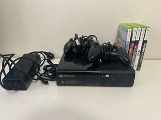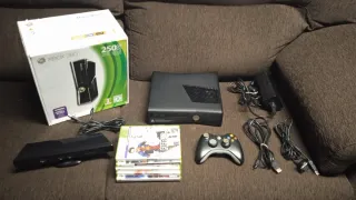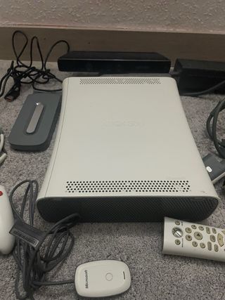 Consola Xbox 360 con accesorios. - Incluye 3 mandos para jugar. - Sensor Kinect para experiencias interactivas. - Disco duro para almacenar juegos y contenido. - Cableado y fuente de alimentación.