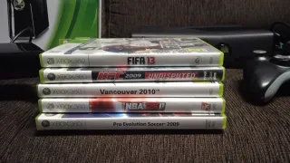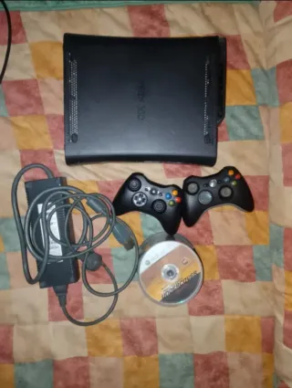 Consola Xbox 360 Slim en color negro, junto con dos mandos y juegos. 🔹 Incluye: • Consola Xbox 360 Slim • Cable de alimentación • 2 mandos originales Xbox 360 (blanco y rosa) • Lote de juegos originales: • FIFA 11 • FIFA 12 • PES 2012 • PES 2013 • Battlefield 3 • Gears of War • Far Cry Instincts Predator • Watchmen: El fin está cerca Parte 1 y 2 • Homefront • Kinect Adventures • Soul Calibur IV 📀 Todos los juegos son originales en su caja. 🔧 Estado: • Consola: buen estado general, con leves marcas normales de uso. • Mandos: funcionan correctamente. • Juegos: discos en buen estado. 📦 Ideal para coleccionistas,