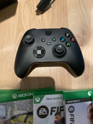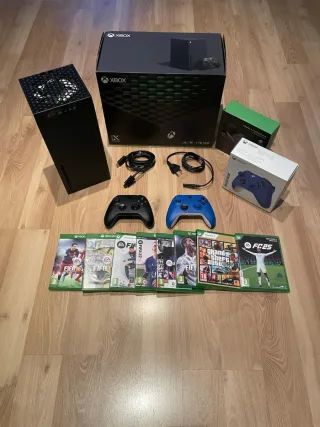 Consola Xbox Series X en color negro, con caja original y accesorios. Es de enero, NO tienen drift los mandos. - Incluye 7 videojuegos - Dos mandos de Xbox, uno negro y otro azul. - Cables de alimentación y HDMI. Precio algo negociable