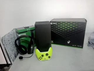 Consola Xbox Series X en color negro con detalles en verde, junto con accesorios. - Mando de color verde lima. - Auriculares inalámbricos. - Caja original de la consola. Cableado