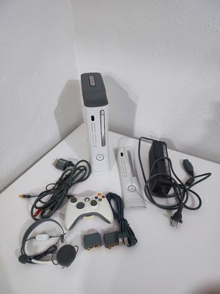 Consola Xbox 360 en color blanco, lista para jugar. - incluye un juego mirar fotos - Incluye mando negro con cable. - Incluye fuente de alimentación. - Incluye cable AV con conexiones RCA.