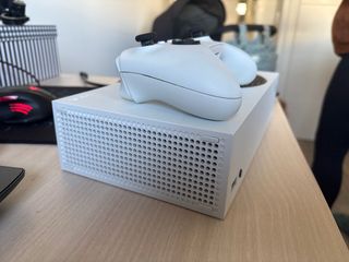 Consola Xbox Series S en color blanco con acabado mate. Incluye dos mandos inalámbricos y plataforma de carga y ventilaccion para la consola .funciona perfectamente. Caja con algun defecto. - Capacidad de 512 GB SSD. - Soporta hasta 120 FPS.