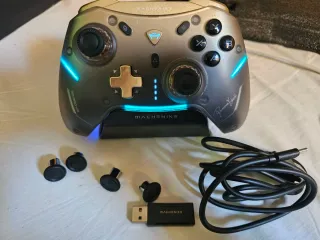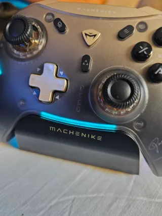 mando para videojuegos Machenike G5 Pro V2. Se trata de un mando gaming inalámbrico compatible con PC, Nintendo Switch, iOS y Android, Xbox Conectividad: Admite conexión por cable (USB-C), inalámbrica de 2.4 GHz (con dongle incluido) y Bluetooth. Características: Incluye joysticks de efecto Hall intercambiables, botones con microinterruptores ópticos, giroscopio de 6 ejes, y cuatro botones macro programables. Accesorios: Viene con una base de carga con iluminación RGB sincronizada, un dongle inalámbrico de 2.4 GHz, un cable USB-C y joysticks de reemplazo de diferentes tamaños.