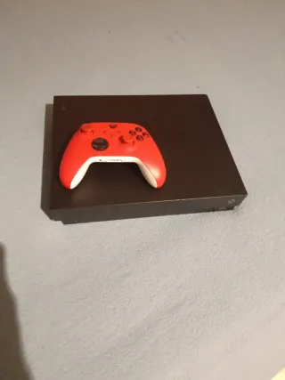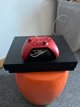 Consola Xbox One X en color negro, junto con un mando de color rojo y cables de alimentación y HDMI, No tiene ningún Golpe, lo vendo por cuestiones de que necesito comprar un Pc Para la universidad - Incluye mando inalámbrico. - Cable de alimentación. - Cable HDMI. - Cable LAN para mejor conexión - Opcional un Forro para el control Está totalmente formateado para nuevo uso.