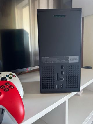 Consola Xbox Series X con disco duro de 1TB, lista para disfrutar. - Incluye mando de color rojo. - Se acompaña de varios videojuegos. - Cables de conexión incluidos. - Expansion card de 1Tb Unico "defecto" en la parte trasera que no influye en su correcto funcionamiento. Se vende por no usar