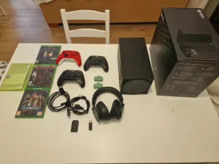 Vendo Xbox Series X 1TB en muy buen estado, con caja original y pack muy completo. Incluye: ✔ Xbox Series X 1TB ✔ Tarjeta de expansión SSD Seagate oficial 1TB ✔ 3 mandos Xbox originales (1 rojo + 2 negros) ✔ Baterías recargables ✔ Juegos físicos (Halo MCC, Metal Gear Solid V, Jump Force) ✔ Cables y embalaje original 🎧 Incluyo auriculares Xbox funcionales (con desgaste estético en almohadillas). Todo funciona perfectamente. Se vende el pack completo.