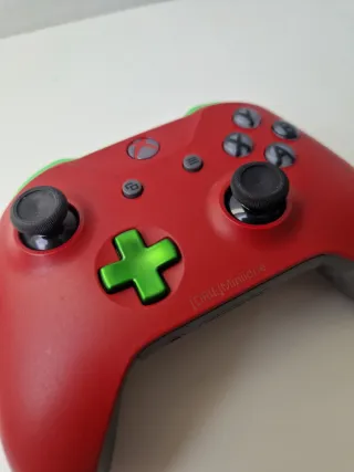 Mando de Xbox personalizado con un diseño único en rojo y verde y gatillos en morado metalizado. Muy buen estado y funciona perfectamente. Tiene conexión Bluetooth, útil para conectar con dispositivos como PC o demás. En la parte de atrás le faltan unas placas de goma como se ve en las fotos. No afecta para nada su jugabilidad, es solo estético.