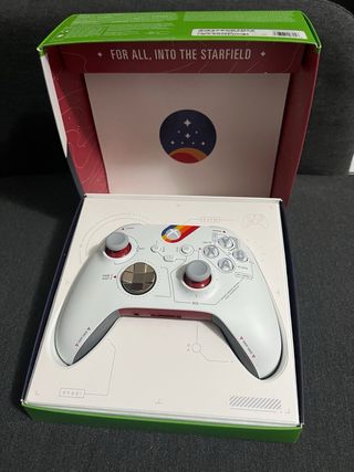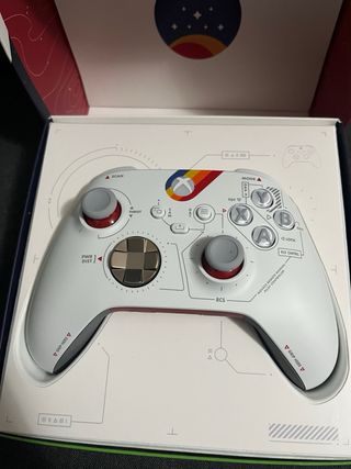 SIN USAR!! Mando de edición limitada para Xbox, inspirado en el universo de Starfield. Su diseño combina el blanco con detalles en rojo y dorado, evocando la estética del juego. - Diseño exclusivo Starfield. - Botones y joysticks de alta precisión. - Textura ergonómica para un agarre cómodo.