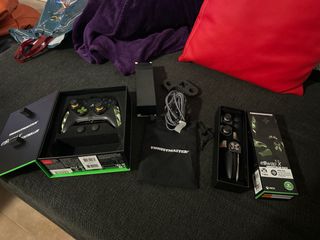 Mando de control Thrustmaster para Xbox. - Diseño en negro con detalles verdes y blancos. - Incluye accesorios y bolsa de transporte.