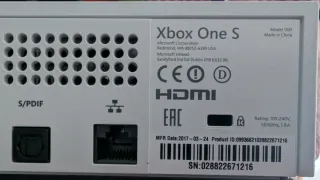 Consola Xbox One S en color blanco, incluye dos mandos para disfrutar con amigos. - Modelo 1681. - Fabricada en China. - Conexión S/PDIF. - Puerto HDMI. - Alimentación 100-240V, 50/60Hz, 1.8A. - Fecha de fabricación: 2017-03-24. - ID de producto: 09936621028822671216. - Número de serie: 028822671216.