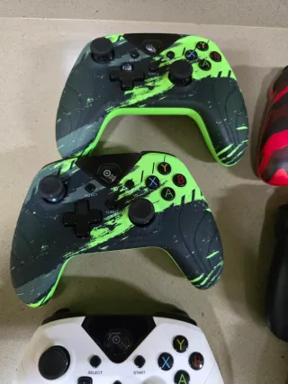 Conjunto de mandos para Xbox. - Mando Xbox con diseño verde y negro. - Mando Xbox con diseño rojo y negro. - Mando Xbox negro. - Mando Xbox blanco con cable. - Mando Xbox blanco con salpicaduras rojas. - Mando Xbox con diseño amarillo y negro. - Joy-Cons amarillos. - Lote de mandos algunos van bien otros drift,se vende para piezas o quien sepa repararlo. -No se admite devolución ya que son para piezas.