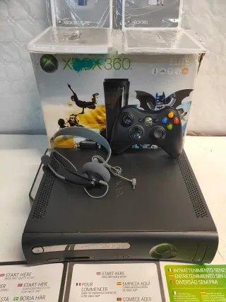 Consola Xbox 360 en caja con accesorios. - Incluye consola. - Dos mandos (uno blanco y uno negro). - Cableado y fuente de alimentación.