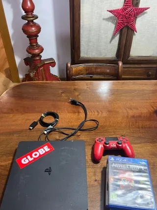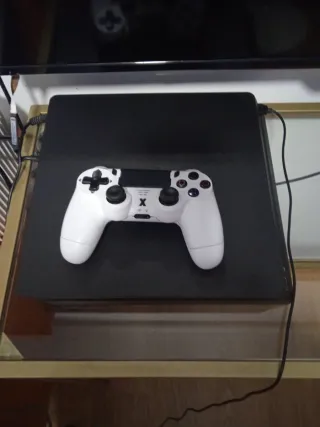 Consola PlayStation 4 Slim con 1TB de almacenamiento. Incluye dos mandos ( otro negro que no sale en las fotos) y juegos. Ambos cables, alimentación y HDMI.