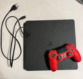 Consola PlayStation 4 Slim en color negro, con un mando DualShock 4 en color rojo. juegos y consola en perfectas condiciones. se pueden comprar los juegos por separado. - Incluye cable de alimentación.