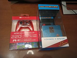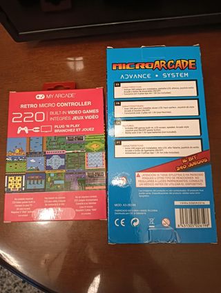 Pack de Micro Arcade que incluye dos consolas (una con diseño de mando y otra de máquina recreativa). Están en perfecto estado. - Mando retro Micro Controller en color rojo. - Consola Micro Arcade con 240 juegos integrados. - Plug 'n Play.