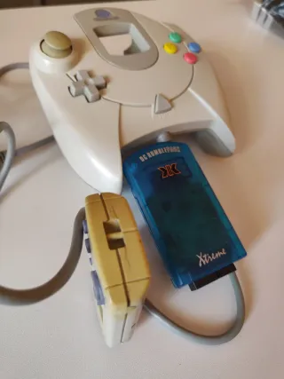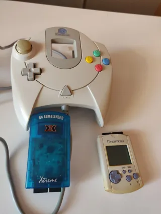 Mando original Dreamcast con VMU original y rumble pack genérico. La VMU está bastante amarillenta por arriba por el paso del tiempo y tiene como dos marcas como se ve en la imagen. Todo funciona perfecto.