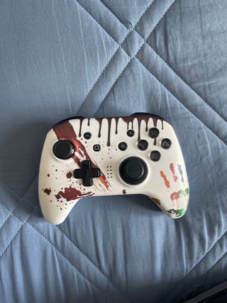 Mando de Nintendo con un diseño único y llamativo. - Base blanca con salpicaduras y goteos en tonos rojos y marrones. - Detalles de huellas dactilares multicolores en un lateral.