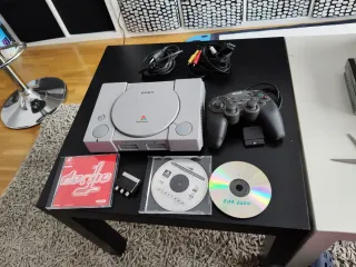 Se vende consola PlayStation en color gris, junto con dos mandos. Los juegos son de la PlayStation 2 no de esta consola.