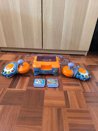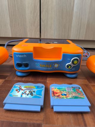 Consola Vtech con dos mandos y dos cartuchos de juegos. - Consola de color naranja y azul. - Mandos con joystick y botones de colores. - Cartuchos de juegos: Spiderman y Winnie the Pooh.