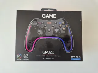 Mando inalámbrico marca GAME modelo GP322 con iluminación RGB y giroscopio. Como nuevo, con ticket de compra y completo con embalajes, cable e instrucciones. - Compatible con PC Windows, Android e iOS. - Conexión Bluetooth 5.0. - Iluminación Neon RGB. - Giroscopio de 6 ejes.