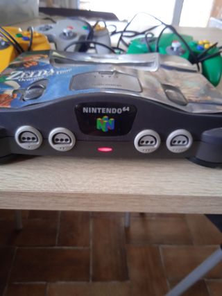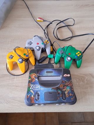 Consola Nintendo 64 personalizada con temática de The Legend of Zelda: Ocarina of Time. Incluye tres mandos de diferentes colores. - Consola Nintendo 64. - Tres mandos (amarillo, gris y verde). - Cables de conexión. Funciona perfectamente