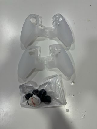 Pack de 2 fundas protectoras para mando de PS5, junto con joysticks ajustables. - Fundas de silicona translúcida. - Incluye joysticks de repuesto en varios colores.