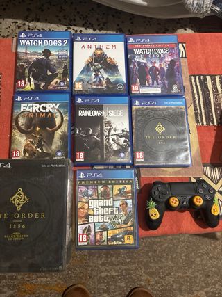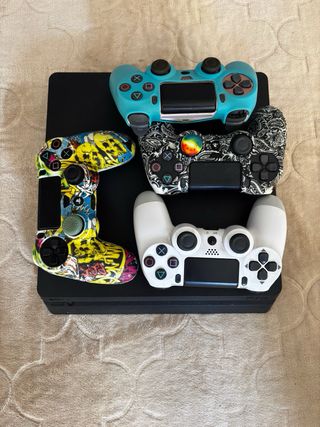 Se vende consola PS4 Slim de 1TB junto con cuatro mandos personalizados, funciona un mando (Blanco), los otros para piezas. - Incluye consola PS4 Slim. - Capacidad de 1TB. - Cuatro mandos con diseños únicos. - Un mando de color azul. - Un mando con diseño de grafitis en amarillo. - Un mando con diseño en blanco y negro. - Un mando de color blanco.
