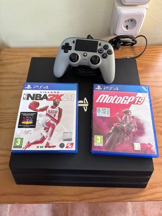 Consola PlayStation 4 Pro en color negro, junto con un mando y dos videojuegos. - Mando de control. - Juego: NBA 2K21. - Juego: MotoGP 19.